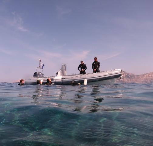 Notre bateau, Aïgo (eau en provençal), est un semi rigide de 9 m, accueillant 14 plongeurs. Il est équipé du matériel nécessaire à la longée (racks à bouteilles, échelle, pavillon alpha) et d'un moteur de 250 CV.